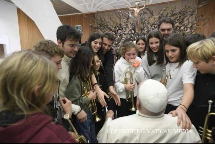 In questi giorni, mio nipote Pietro Paolo, 12 anni, ha vissuto un’esperienza straordinaria: è andato a Roma con la banda musicale in cui suona la tromba e ha incontrato Papa Francesco. Tra tutti i ragazzi presenti, Pietro è quello che ha avuto il coraggio di appoggiare la mano sulla spalla del Papa.